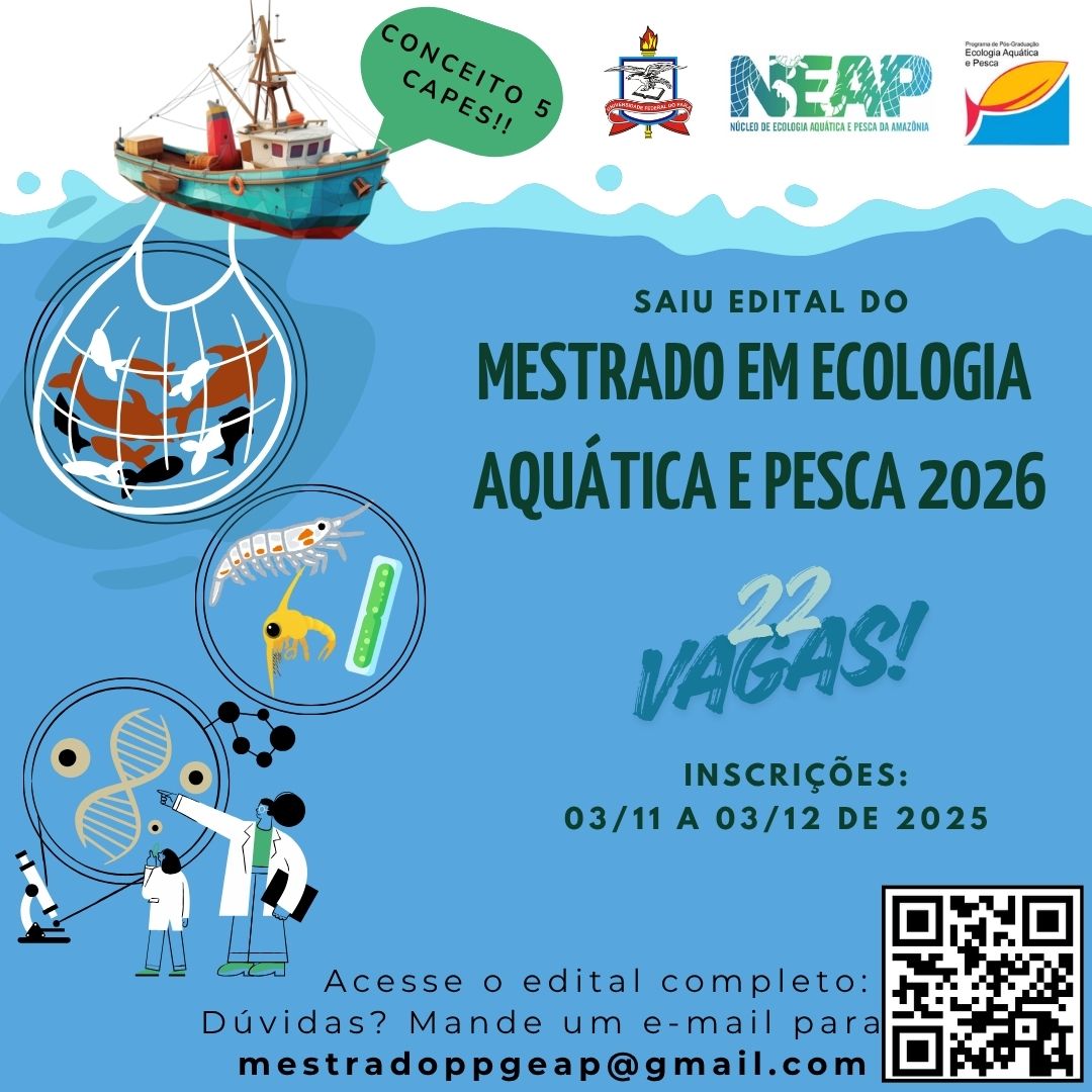 Estão abertas as inscrições para o Processo seletivo de mestrado do Programa de Pós-Graduação em Ecologia Aquática e Pesca (PPGEAP) da UFPA!